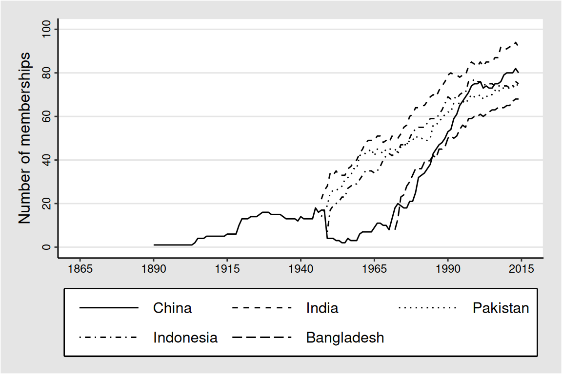 Number of memberships for a country. We select here five countries in Asia: India, China, Pakistan, Indonesia and Bangladesh.