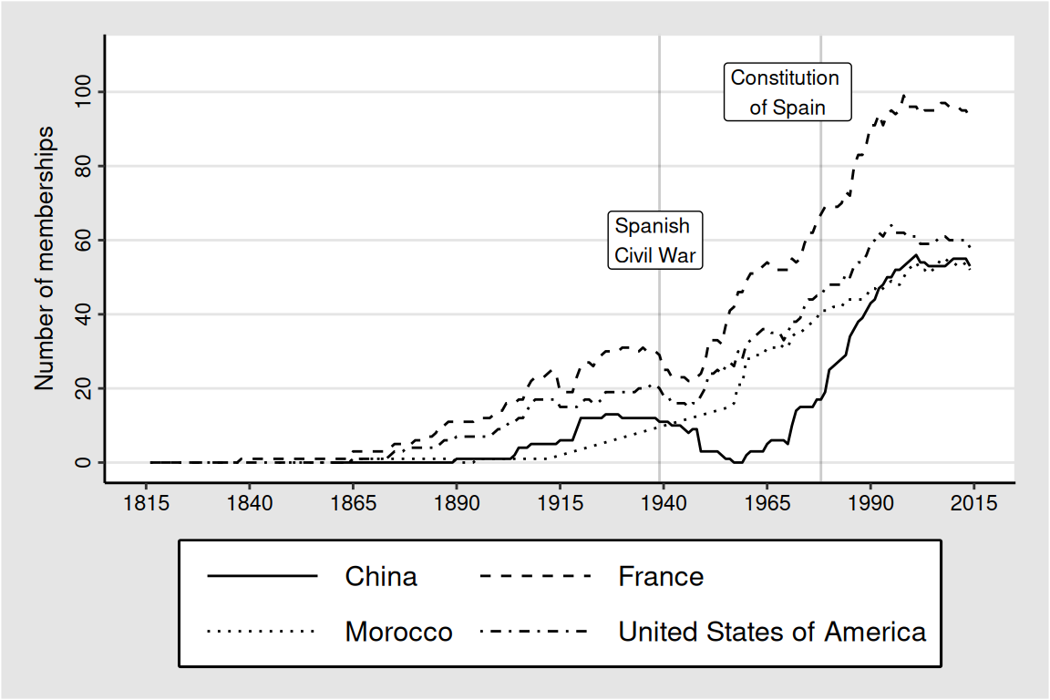 Number of shared full memberships between Spain and four selected countries: