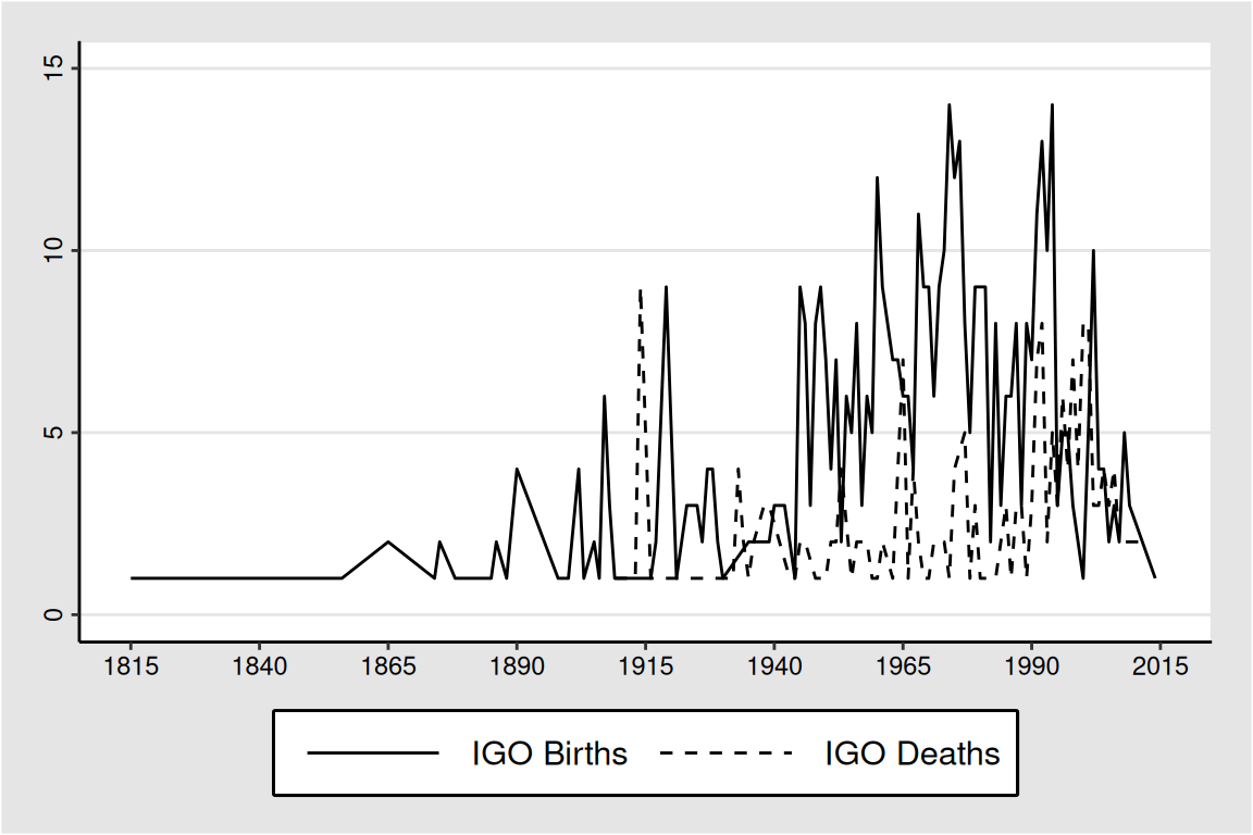 This plot shows how many IGOs were “born” and “died” in each year