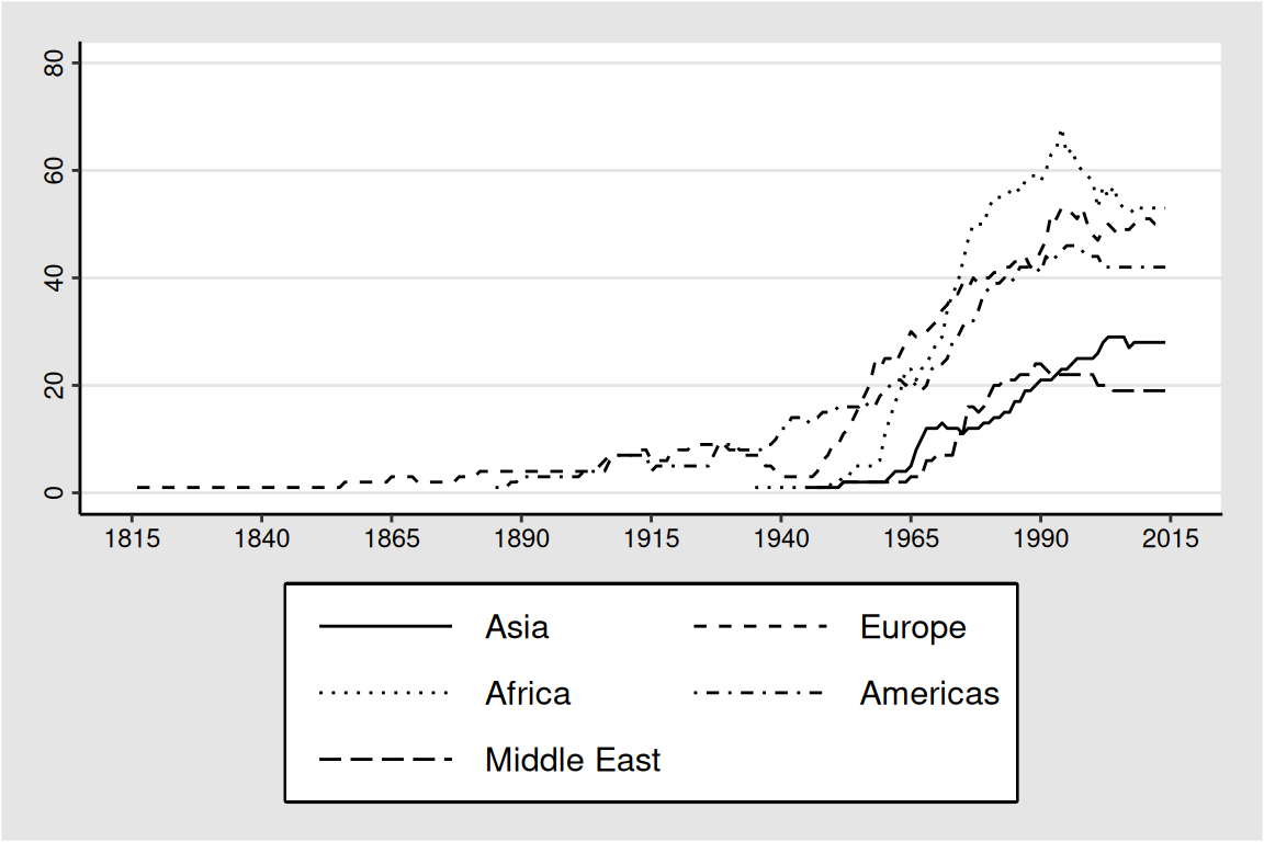 A plot with the number of IGOs by region. The definition of region is based on the original definition by J. C. Pevehouse et al. (2020), as provided in the complementary replication data set (PRIO 2020):