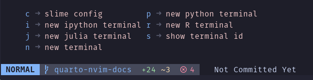 The Quarto Neovim plugin aims to not reinvent the wheel. Existing plugins in the Neovim ecosystem are leveraged to provide the full experience. Some of the features provided by quarto-nvim and enhanced by plugins found in the kickstarter configuration are: