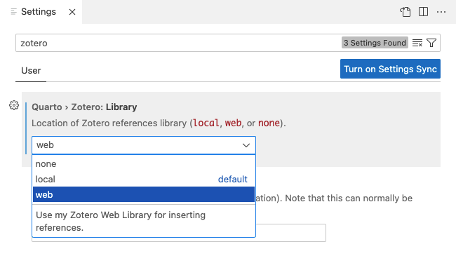 If you are running both VS Code and Zotero on your desktop, then no additional configuration is required for connecting to your Zotero library. If however you are using VS Code in a web browser and/or want to access your Zotero library over the web, then a few more steps are required (see the Zotero Web API section for details).