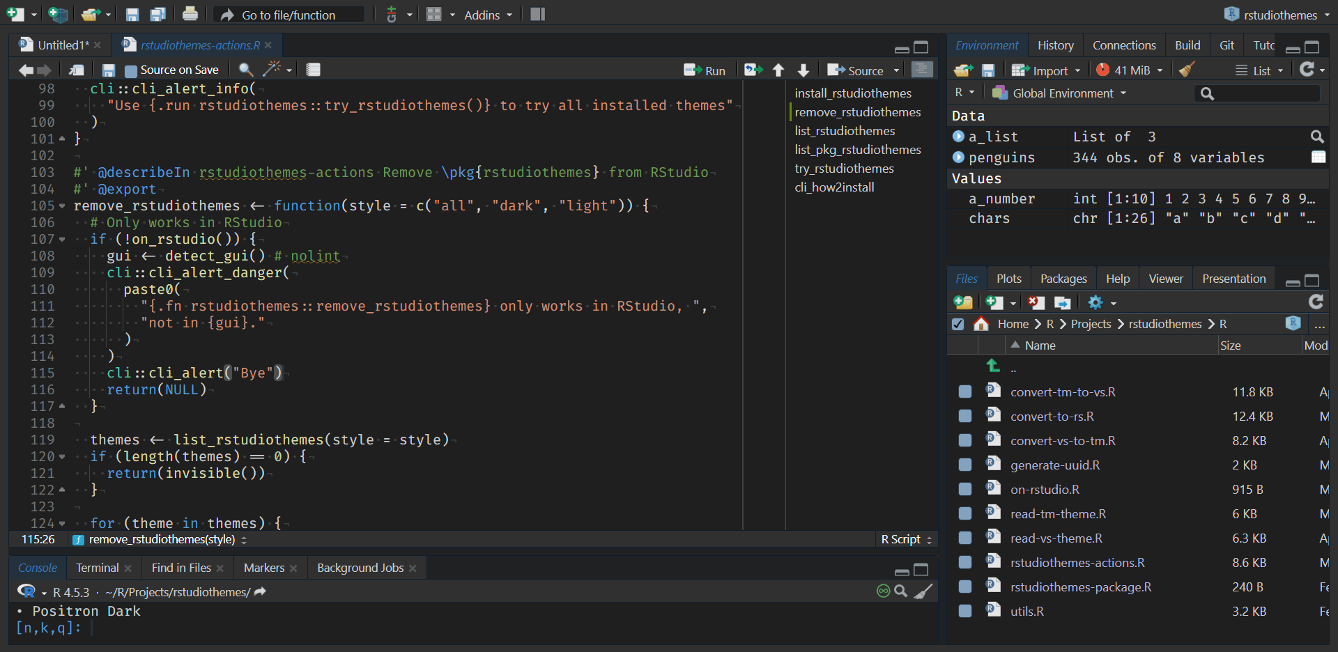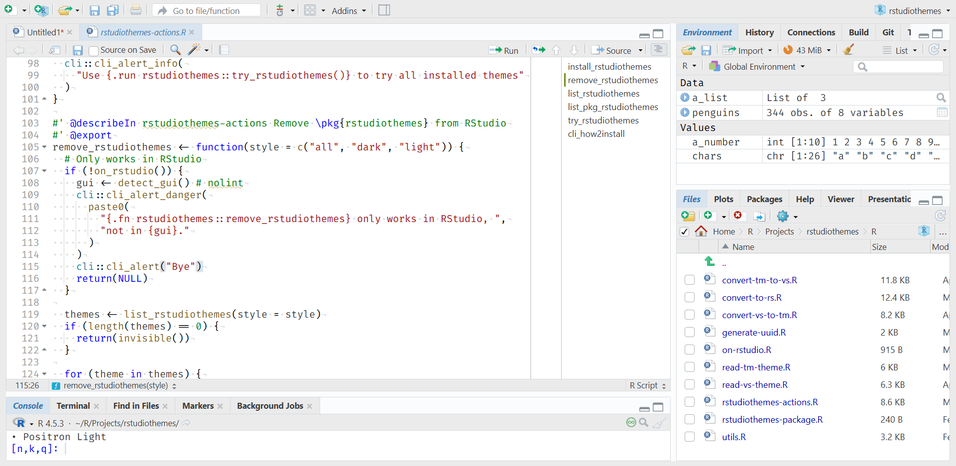 We also distribute all bundled themes in a single .zip file dist/rstudiothemes.zip. Unzip and install using the RStudio IDE interface.